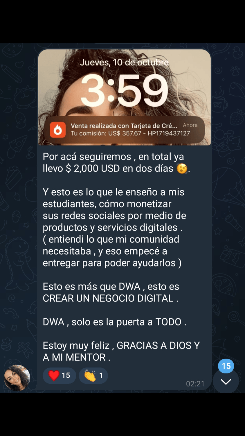 Empezó sin experiencia, completamente desde cero y ahora en un solo día ha podido ganar $497 dólares revendiendo el curso DWA. Con 1 sola venta ha ganado lo que antes ganaba en 1 mes trabajando 15 horas al día remodelando casas.