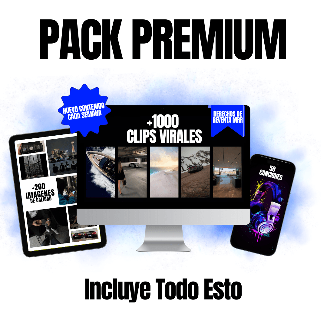Imagina un Pack de Contenido con los mejores clips, las mejores imágenes y las mejores canciones, que te premitiera crear contenido de mejor calidad y muchos más rápido, que se renueve cada semana para que siempre tengas el contenido más viral y que además puedas venderlo y así ganar dinero. Ese Pack existe, y está listo para llevarte al siguiente nivel.